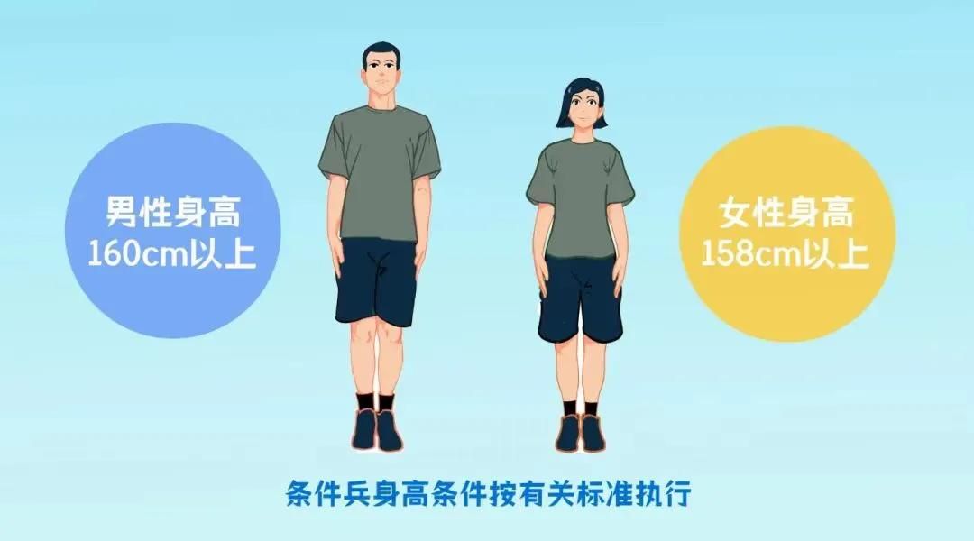 男性身高160cm以上,女性身高158cm以上,合格。条件兵身高条件按有关标准执行。