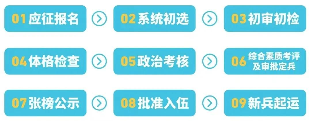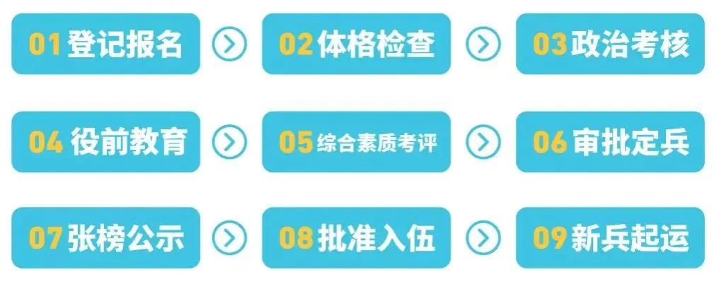 从应征报名到新兵起运,所经历的每个环节对应征青年都至关重要。小伙伴们可以提前了解应征流程与重要的时间节点。