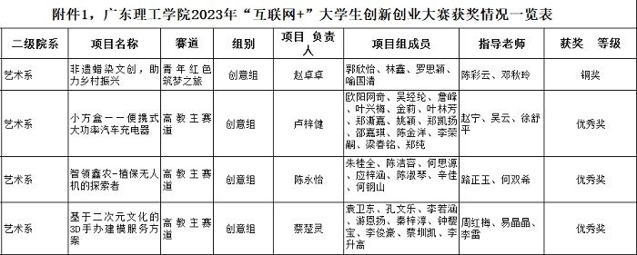 艺术系有4支队伍在总决赛中取得了不错的成绩,分别有:《非遗蜡染文创,助力乡村振兴》荣获铜奖;《小方盒——便携式大功率汽车充电器》、《智领鑫农-植保无人机的探索者》、《基于二次元文化的3D手办建模服务方案》荣获优秀奖。