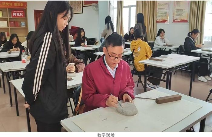 讲座结束后,同学们参与了端砚制作体验环节。在老师的引领下,同学们围坐一起,全神贯注地雕琢着手中的砚台,深切地感受到了传统技艺的独特魅力。在制作过程中,同学们神情专注且投入,仿佛在与端砚进行一场心灵与文化的对话交流。