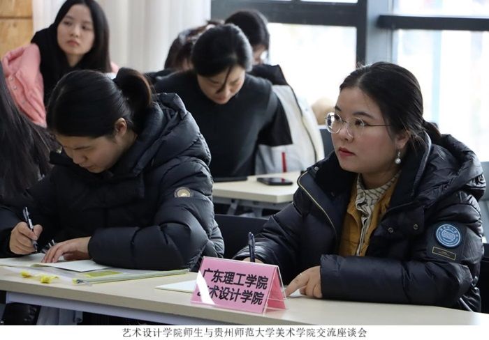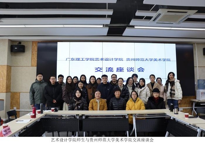 下午,研学团队一行人抵达贵州师范大学美术学院,继续展开深入的座谈交流。贵州师范大学美术学院党委书记郑绍玲、艺术设计系主任龚敏、服装设计系主任袁琳、视觉传达系主任李显元等骨干教师悉数出席。双方就教学模式的创新、设计前沿AI课程的开设,以及如何将新兴科技融入艺术设计专业等议题进行了深入探讨。贵州师范大学美术学院分享了其将理论教学与实践教学紧密结合的宝贵经验,为广理师生提供了全新的教学思路与启示。