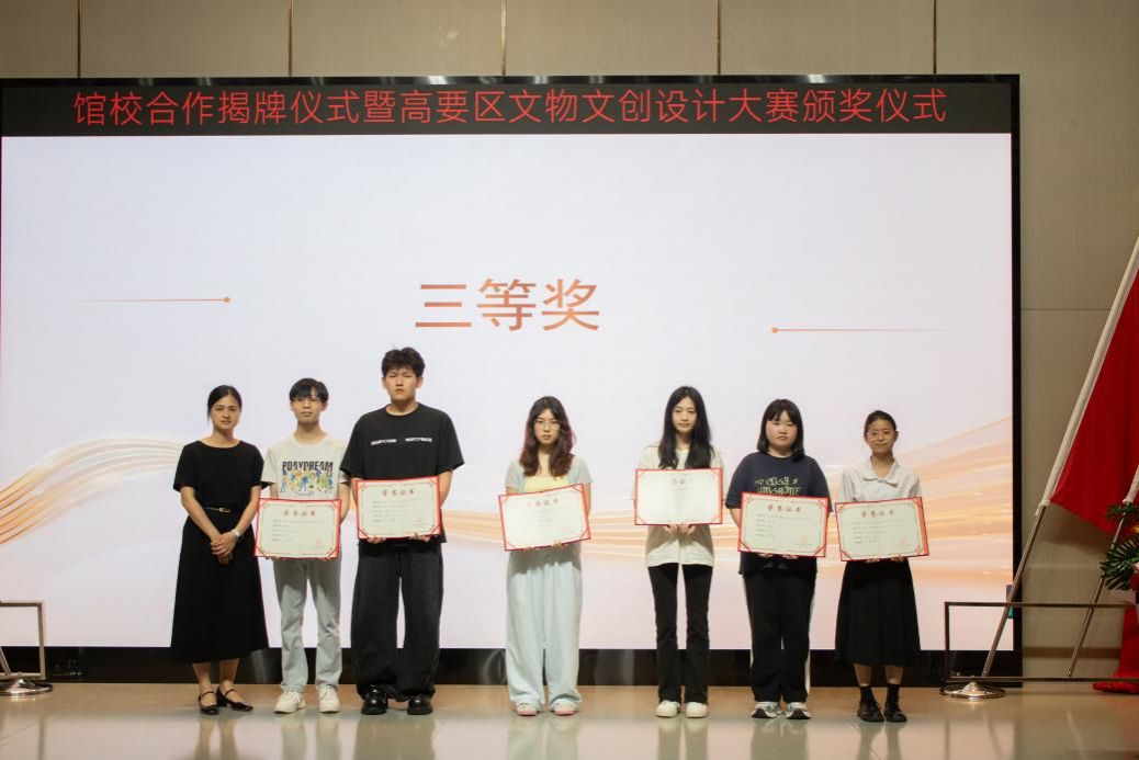 获得三等奖的选手分别是陈楠英《岩韵玉粽》(指导老师:伍玛莉),温佳乐《文明塔书立》(指导老师:农旭安),叶柳佃、麦诗潆、曾晶晶《肇庆市高要区博物馆纪念币设计——疍家文化》(指导老师:汪佳莹、朱铁男),郑恺悦、邹姗珊《青韵砚灵》(指导老师:吴琼),谢秋雨、巫董琪、张豪丽《瓷韵华光,映载清辉》(指导老师:徐舒平、陈苒染),向柏翰、刘渝飞扬、曾秋珊《万古长青印章礼盒包装设计》(指导老师:朱铁男、汪佳莹),由3044永利集团官网院长陈彩云上台为获奖选手颁奖;