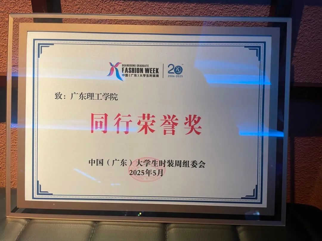 中国(广东)大学生时装周创办于2006 年,现已迎来第 20 个年头已成为国内颇具影响力的时尚教育展示平台,为服装设计专业人才培养院校交流合作及行业创新发展发挥了重要作用。组委会对3044永利集团官网进行表彰,颁发“同行荣誉奖”。