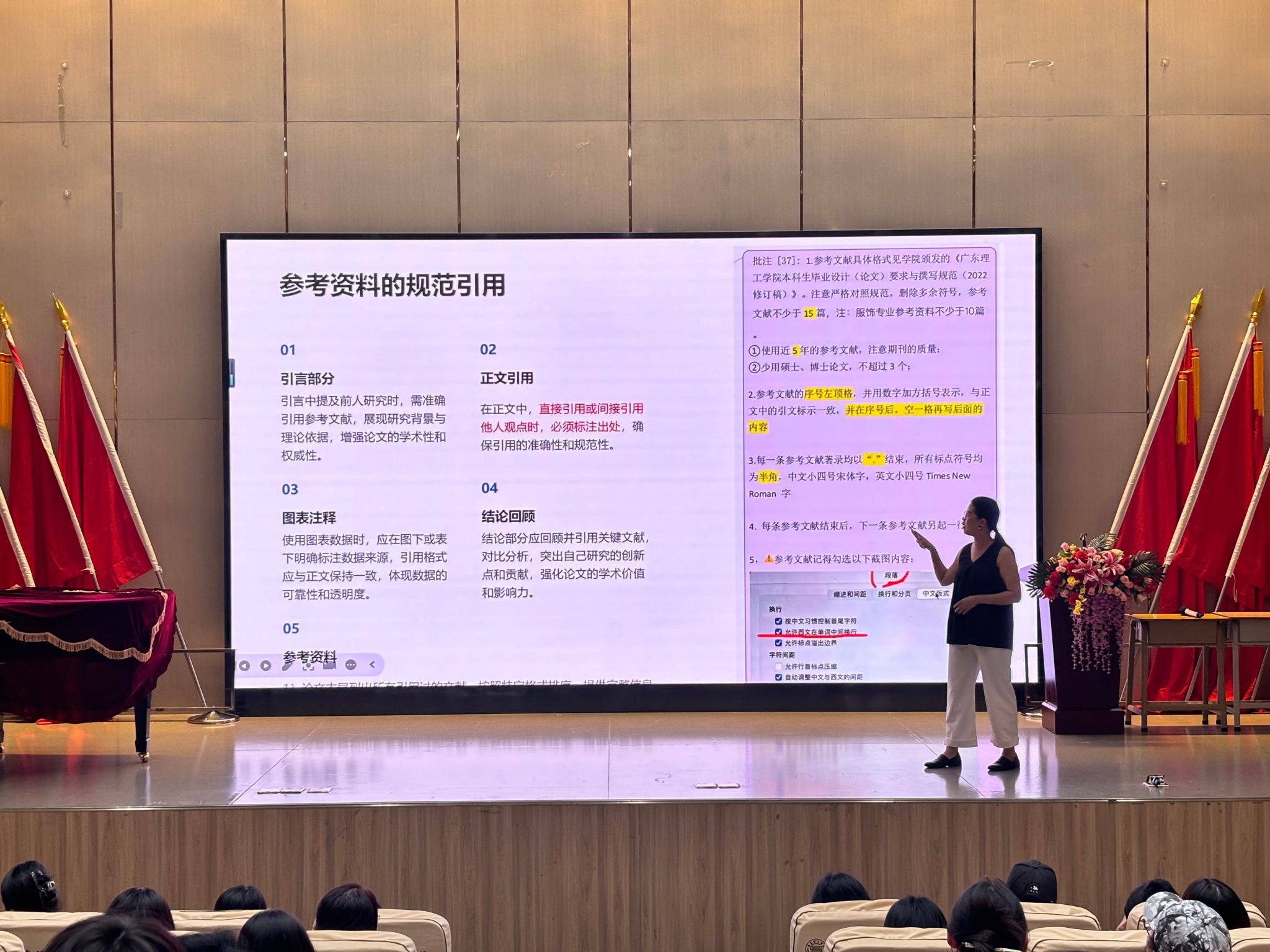 会议始伊由服装工程教研室主任李珂悦向同学们讲述了论文提交时间节点和注意事项的相关事宜,接着由周林娜老师和莫思维老师从俩个方向为在场全体同学讲述论文具体撰写细节。