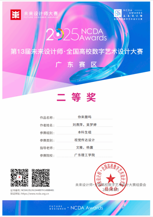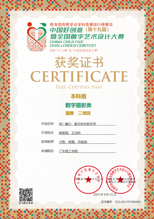 此外,学员们在赛事中屡创佳绩:在第十九届中国好创意暨全国数字艺术设计大赛中,陈亮雨、王浚林同学的作品荣数字摄影类的国赛二等奖;在第13届未来设计师·全国高校数字艺术设计大赛中,刘燕萍、吴梦婷的作品荣获广东省二等奖;