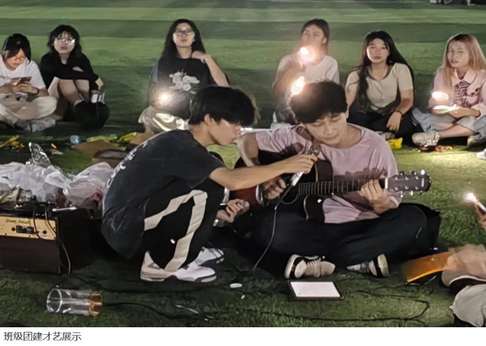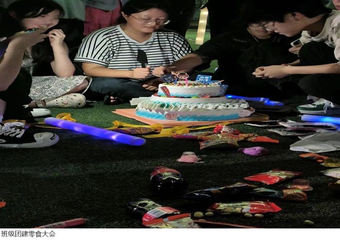 活动伊始,先进行了踩气球等趣味游戏,加强了同学们之间的交流和沟通。本次活动精彩纷呈,首先进行了才艺展示环节,开展了即兴歌唱等活动。接下来就是零食大会,大家纷纷享受着丰盛的零食大餐以及班级团建的大蛋糕,最后进行班级合影留念,将团建永远定格在相片里。