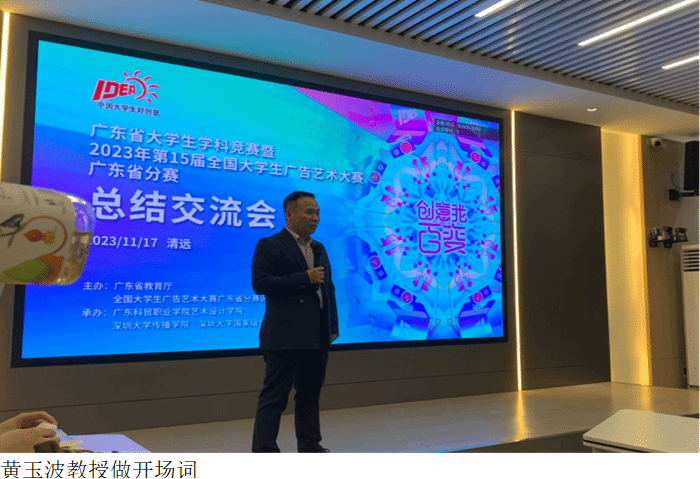 首先,整个活动由大广赛广东省分赛区组委会秘书长、深圳大学传播学院副院长黄玉波做开场词并介绍本次比赛广东省分赛区的相关情况。黄副院长表示:本届大赛以“创意我百变”为主题,吸引了来自全国各类高等院校的在校全日制大学生积极参与,参赛院校达1857所,参赛学生约187万人次,网上提交作品932848件,赛事影响力巨大;获全国奖作品总数7163组:其中全国一等奖210组,二等奖651组,三等奖1422组,优秀奖4880组。广东赛区经过公平、公开、公正的初审和复审,共评出一等奖455组、二等奖923组、三等奖1285组;另有309名教师获评优秀指导教师、30位教师获优秀组织工作者。同时,广东赛区获全国奖作品558组,其中获全国一等奖32组、二等奖47组、 三等奖104组、优秀奖375组。在今年的赛事中,广东赛区作品获奖总数在全国29个赛区位居第一名!