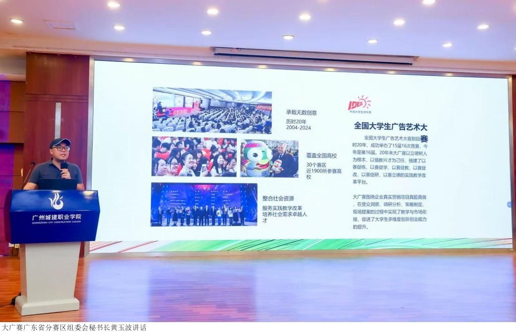大广赛广东省分赛区组委会秘书长黄玉波介绍了2024年大广赛的参赛要点。他围绕第16届大广赛的命题及赛程安排、赛事变化、参赛截止时间等注意事项展开了详细说明,并着重解析了第16届大广赛中新增的科技类创作方向。他表示,大广赛以立德树人为根本,以强教兴才为己任,搭建了以赛促练、以赛促学、以赛促教、以赛促改、以赛促研、以赛立德的实践教学改革平台,企业真实营销项目成为教学核心,实现教学与市场的紧密衔接。鼓励学生积极参与,锻炼创新表达能力,遵循导向、严谨审题、深入理解策略,以在实战中实现自我提升与成长。