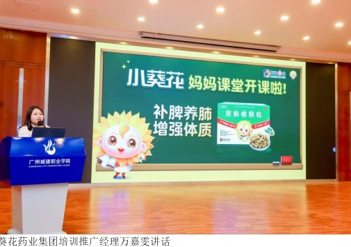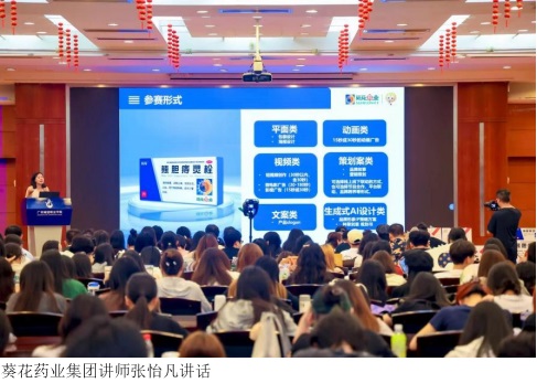 葵花药业集团培训推广经理万嘉雯女士在介绍完葵花药业的基本情况后,针对小葵花芪斛楂颗粒产品,本文对命题进行了深入剖析。呼吁参赛学生通过平面、视频、动画等多种形式的作品,精确抵达目标受众,鲜明突出产品核心优势,展示品牌理念,体现其高价值属性,同时呈现出富有创意、独具匠心、深刻洞悉的作品。