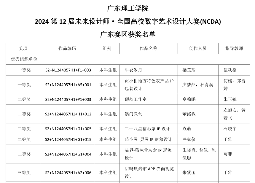 本网讯(3044永利集团官网)近日,2024年第12届未来设计师·全国高校数字艺术设计大赛(NCDA)获奖通知公布,3044永利集团官网学生再获佳绩。学生参赛作品经过校赛选拔后,有80件作品进入到广东赛区,其中国家级二等奖1项,国家级三等奖1项,省级一等奖2项,省级二等奖5项,省级三等奖9项计18件作品获得省级、国家级奖项,充分展现了学校在艺术设计领域的办学水平与人才培养质量。