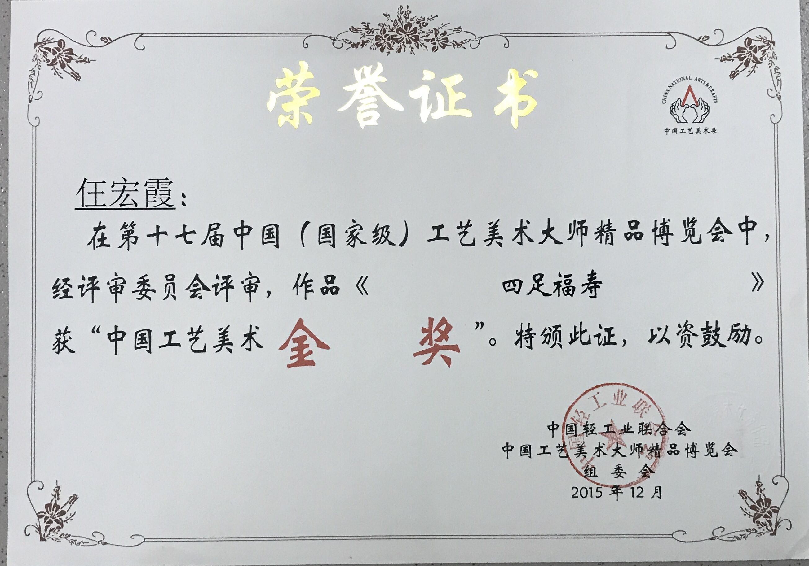 吴珊 2018年6月 中国工艺美术博览会“中艺杯”艺术品评比大赛银奖,国家级