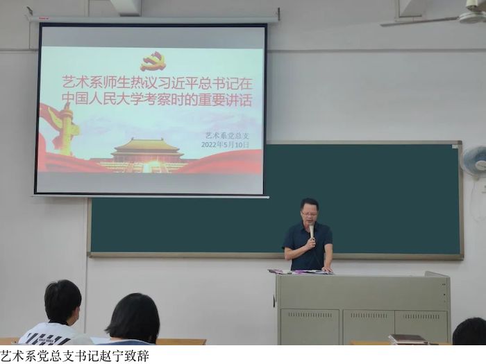 艺术系党总支书记赵宁表示,习近平总书记到中国人民大学考察时强调,要坚持党的领导,坚持马克思主义指导地位,坚持为党和人民事业服务,落实立德树人根本任务,传承红色基因。