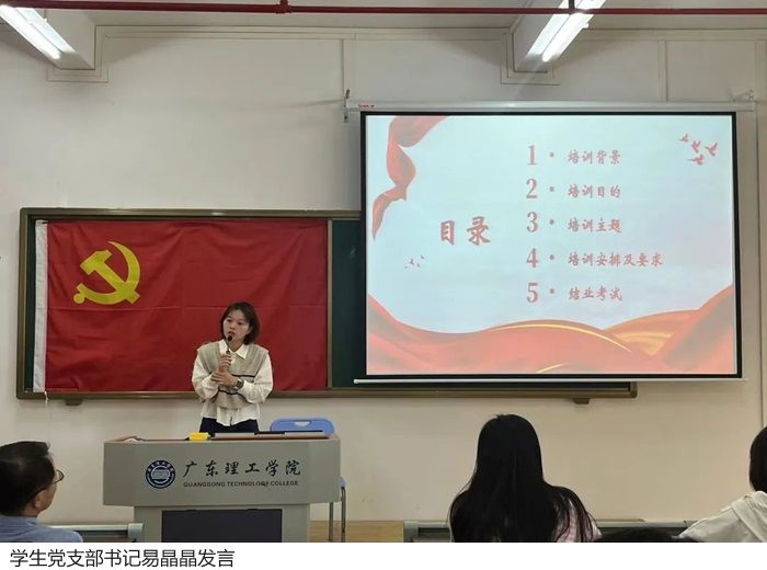 首先进行典礼第一项,学生党支部书记易晶晶进行了发言学生党支部书记易晶晶介绍了本次入党积极分子的培训背景、培训目的、培训主题、培训安排及要求等,并强调了“大学生是国家宝贵的人才资源,是民族的希望,是祖国的未来。”入党积极分子作为学生优秀代表,更应该加深对党的思想认识,弘扬全心全意为人民服务等思想精神。希望通过本次党校培训班的学习,使广大学生进一步了解党的有关知识,掌握党的基本理论知识,明确党员标准及发展程序,引导他们以党员的标准严格要求自己,努力发挥先锋模范作用。