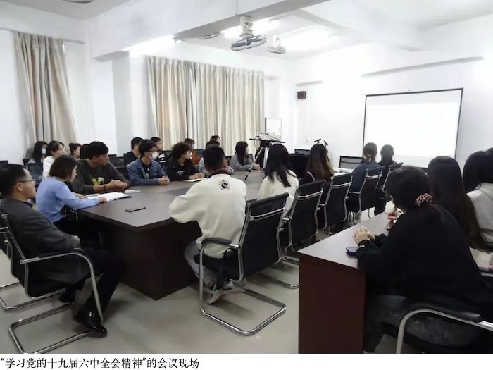 本校讯(艺术系宣传部 邓堪柳)2021年11月15日中午12点10分,艺术系学生党支部于艺术楼会议室召开了关于“学习党的十九届六中全会精神”的会议,党总支书记赵宁、学生党支部书记易晶晶、学生二十七期建党对象及二十八期发展对象参会。